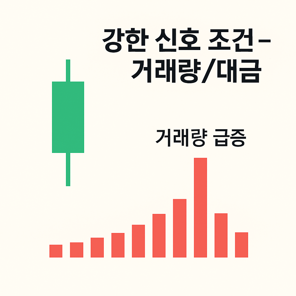 - 당일 거래량 ≥ 20일 평균의 1.5배 이상(대금 기준도 OK)